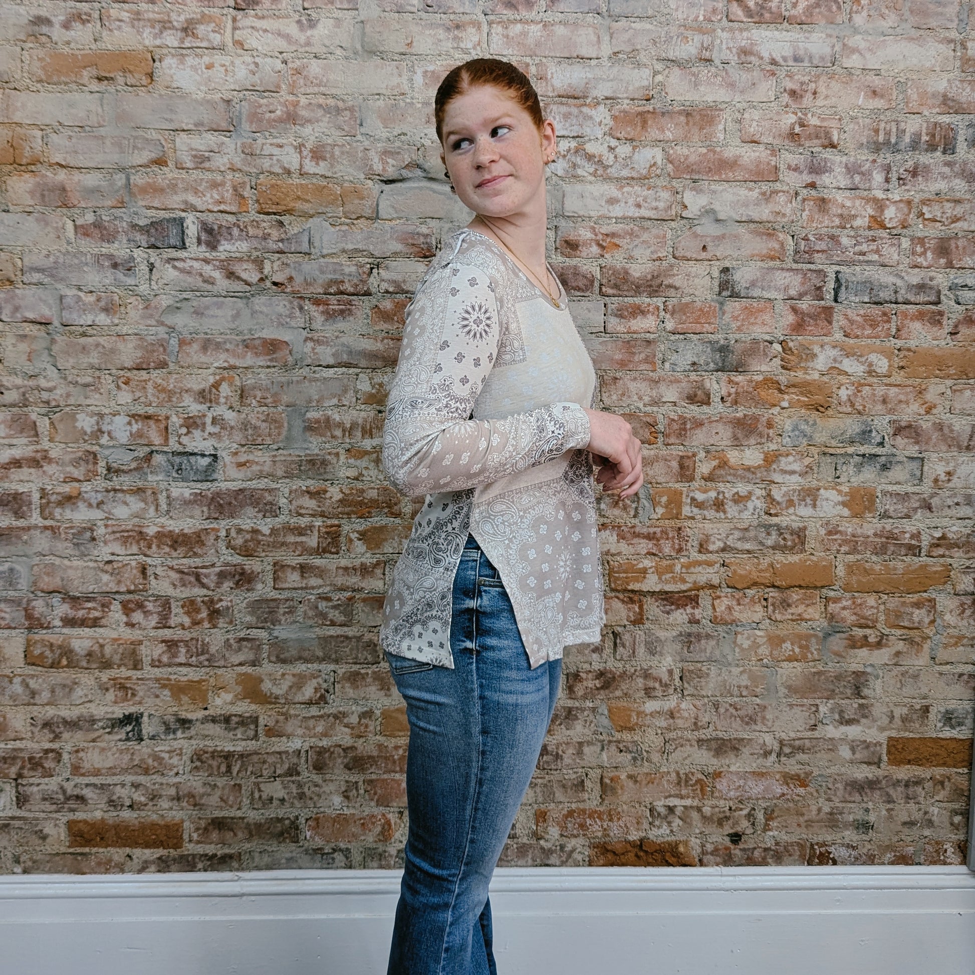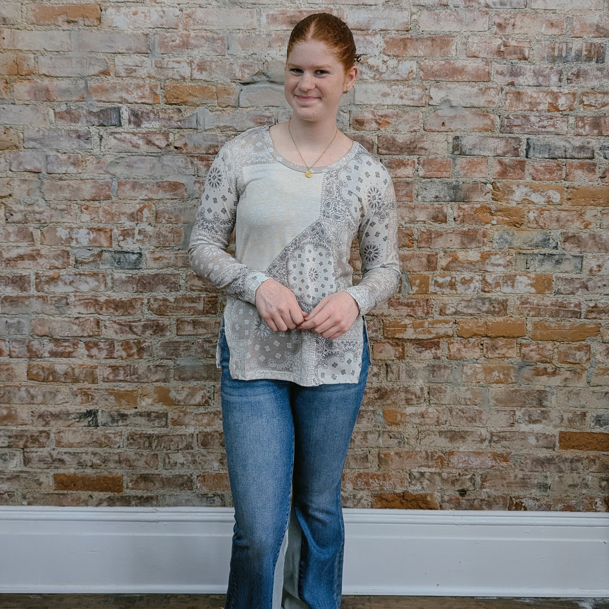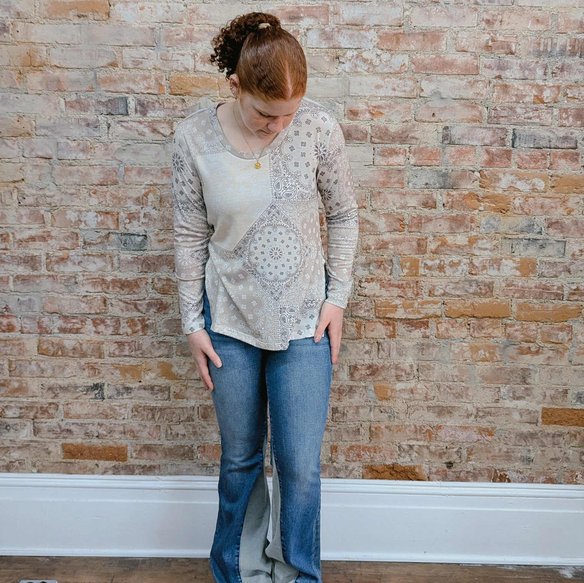 This bandana Print Long sleeve is perfect for when the days start to get chilly. It's a thinner top so perfect for when it's too cold to wear short sleeves but too hot to wear your sweaters. The perfect in-between top! Plus the bandana print adds such a cute touch! And the brown/ green/ cream colors in it make us think of fall. We also love when tops have the side slits in them. It just makes for an extra feminine touch and makes the top more flattering instead of sitting boxy. Pair this top with dark or even brown/ cream jeans.