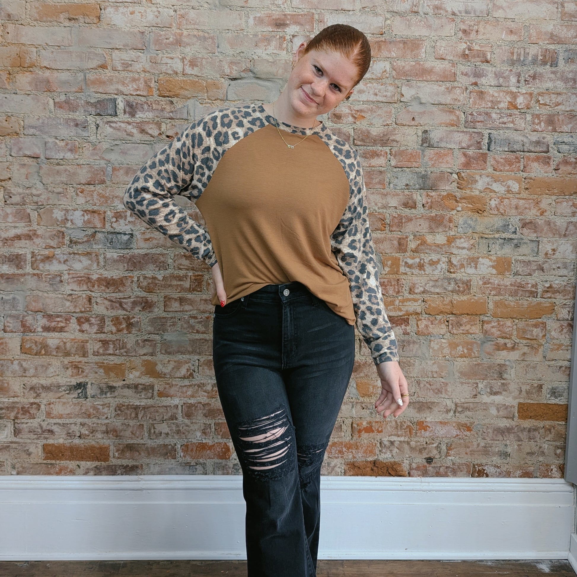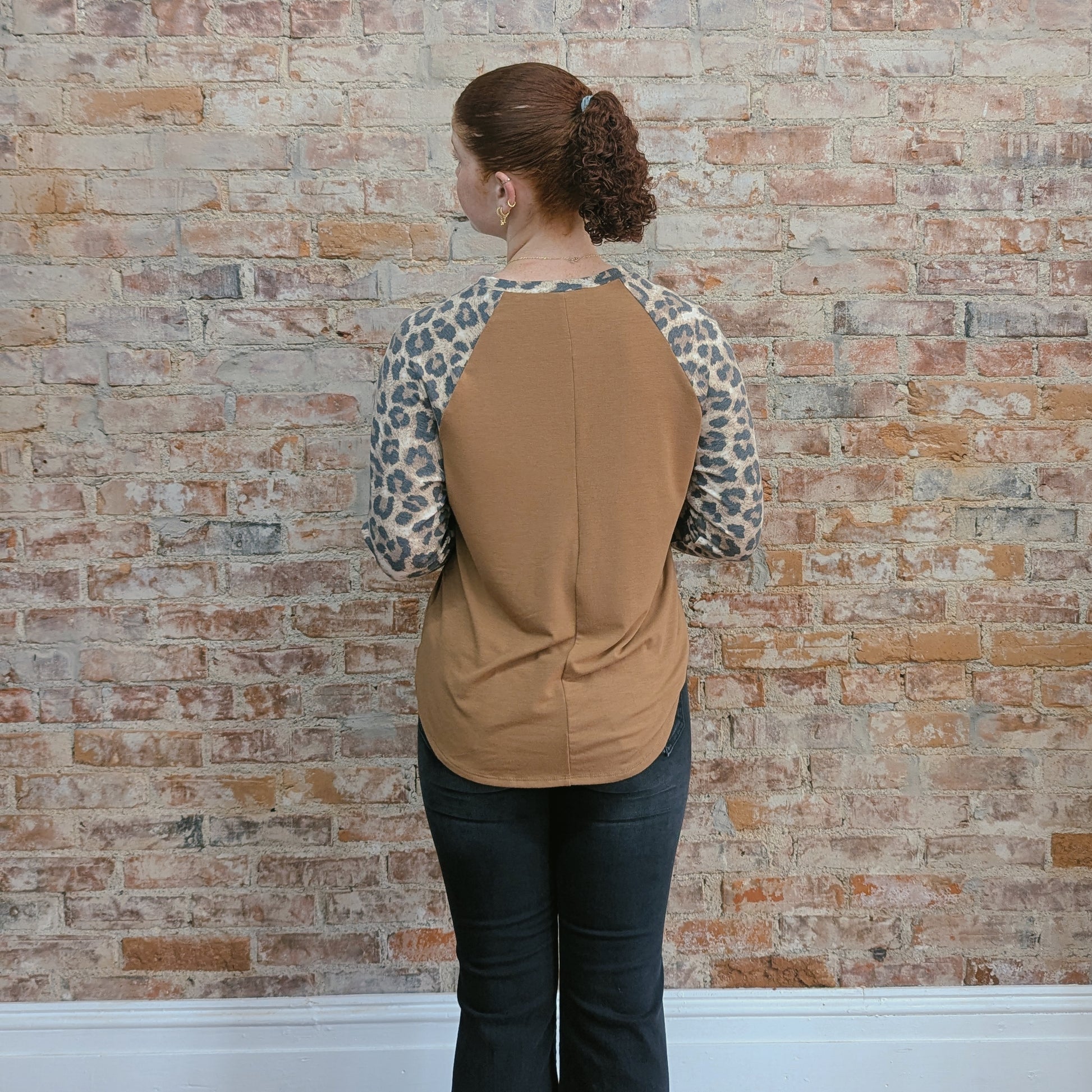 We love that this top is plain with animal print sleeves. Plus the caramel brown color is so cute and pairs with the animal print perfectly. This top is so soft and has a scooped hem for a flattering, feminine look. Wear this top with your favorite pair of jeans or leggings!