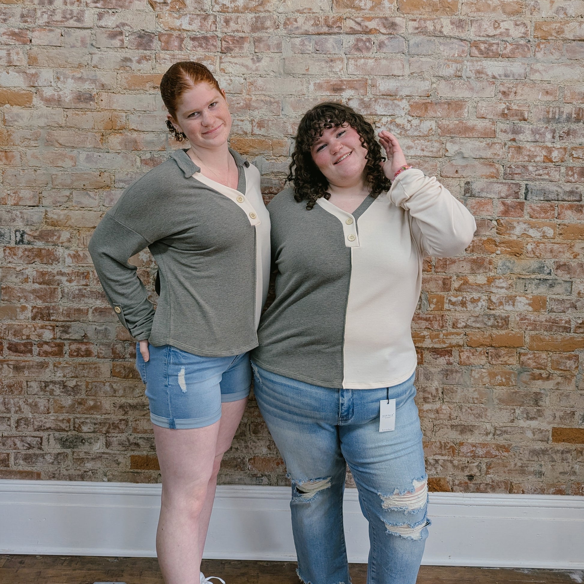 Leah is wearing a size 1x and Rachel is wearing a small