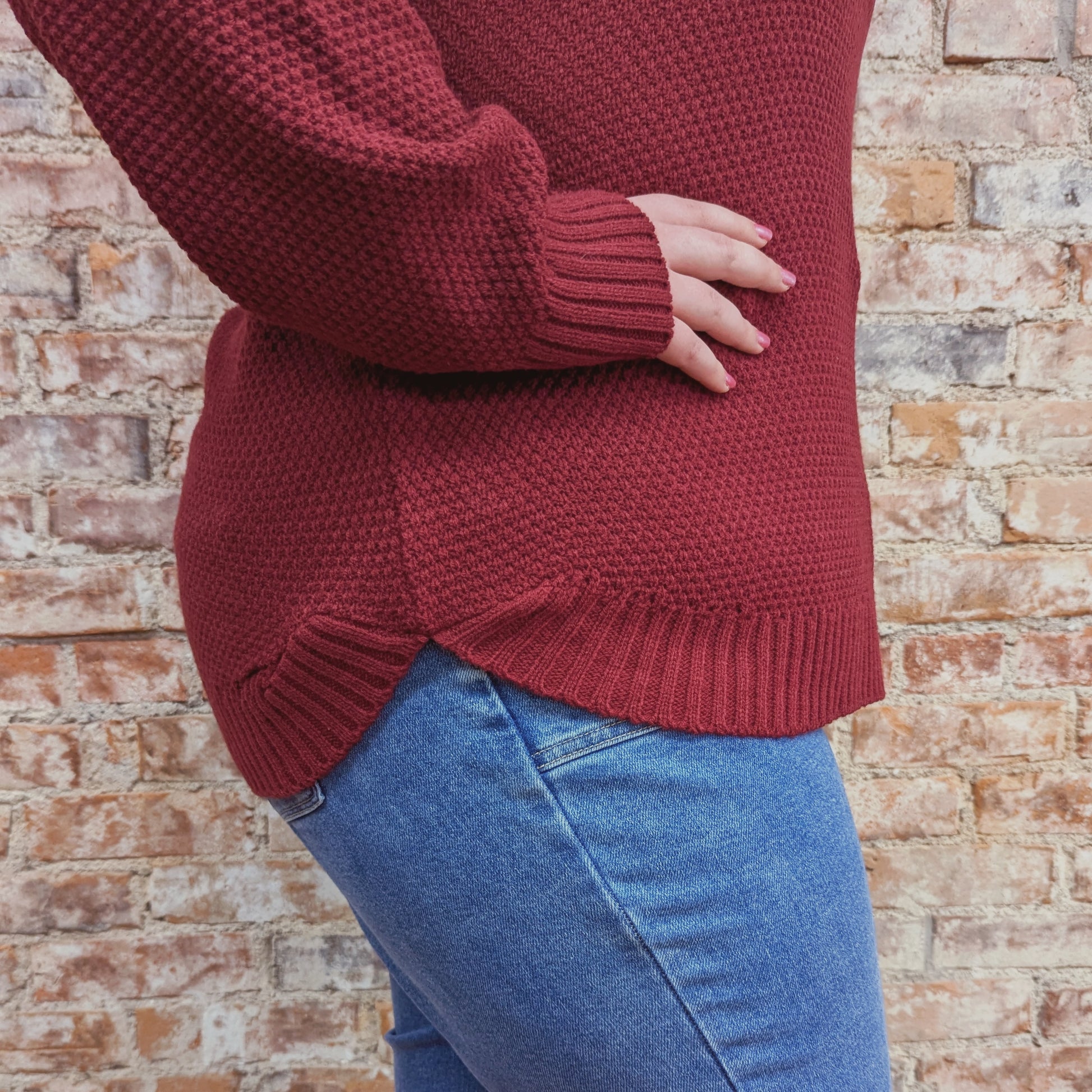 This is a lighter weight sweater that has a waffle knit pattern, and the hem scoops in the front and back and is longer in the back. We love all the little details about this sweater that make it so fun! But, our favorite part about this sweater has to be the color! Wear this sweater to your next holiday party!