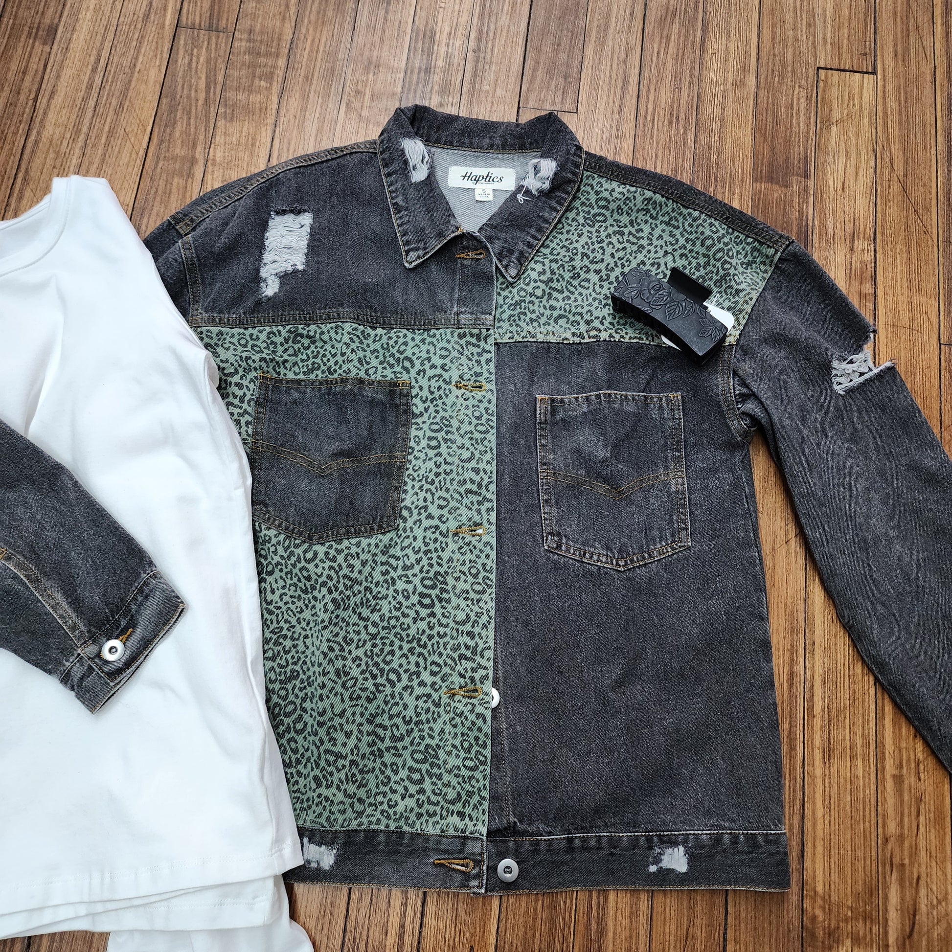Get ready to layer this season with our fun denim jacket. This jacket features a stylish animal print and distressed features that make it a classic statement piece. We feel like a good denim jacket never goes out of style and adding this one to your wardrobe is a must!