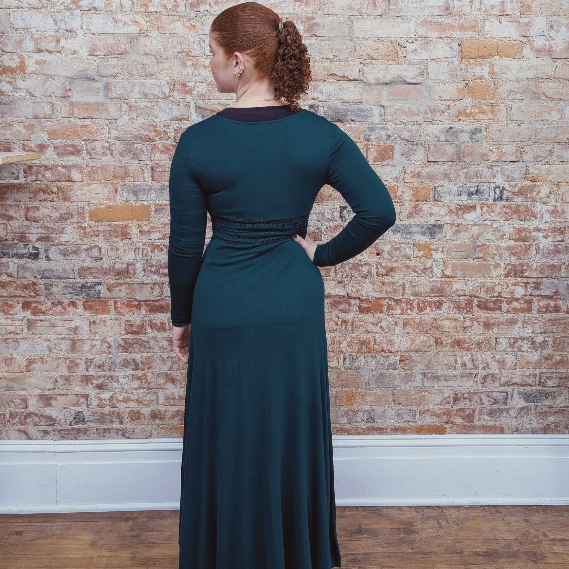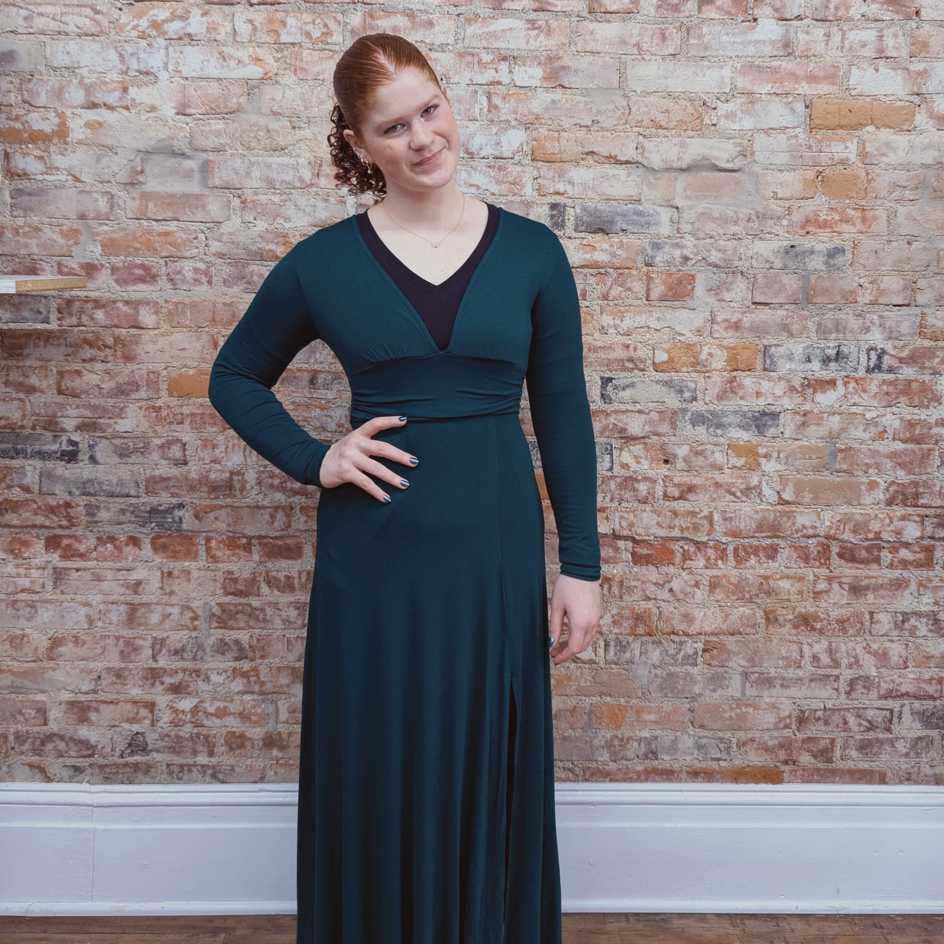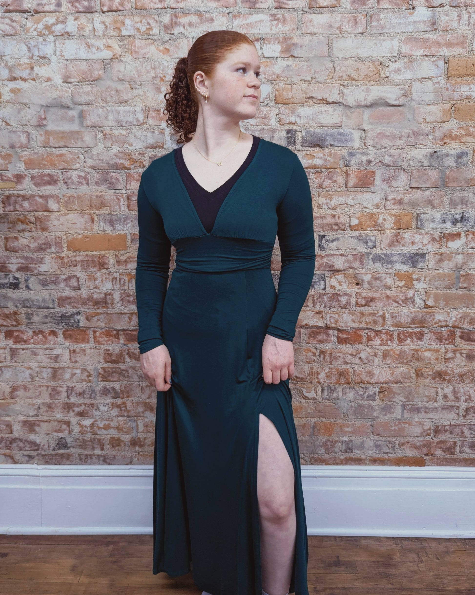 It is a very soft, stretchy fabric that is comfortable. It also is flattering on everyone! Because of it's thick waistband and little slit on the leg it's very elegant. The neckline does plunge down so you do have to wear a tank top underneath, but we think that makes for the perfect way to make it your own! You can wear any sort of neutral colors or patterns underneath. Overall, we know you'll get a lot of use out of this dress this holiday season!