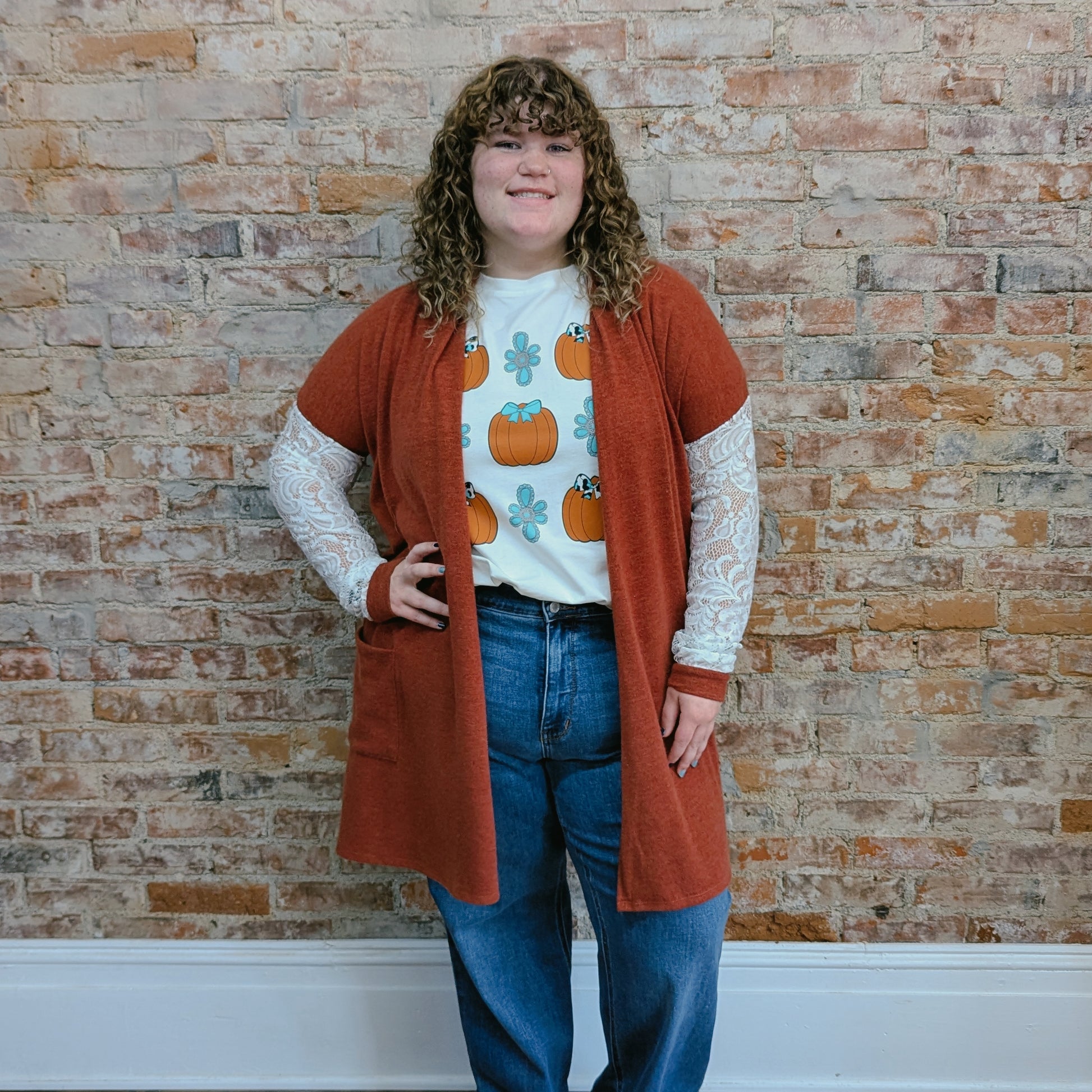 It's super soft and this gorgeous red-orange color. It's a longer cardigan and has two pockets in the front. But our favorite part of this cardigan is the lace sleeves! It adds and elevation to this cardigan making it so much more than any ordinary cardigan. Wear this with some jeans and your favorite fall graphic for a cute, comfy look!
