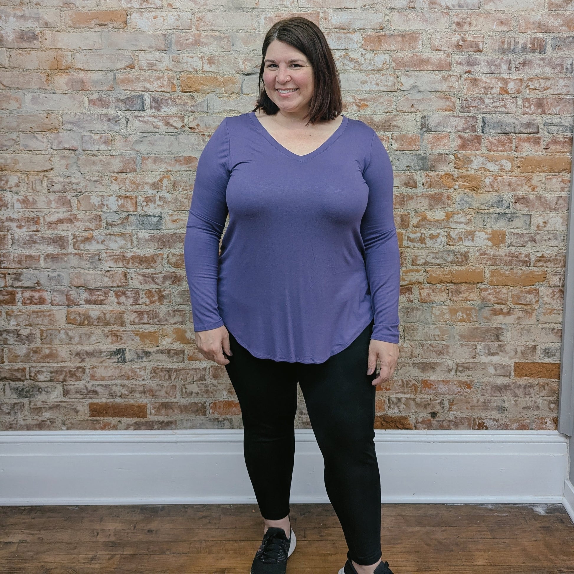We just love the lilac purple color. And this long sleeve is a thinner material so you won't overheat or feel constricted in it. It is a flowy fit with a scooped hem longer in the back and it has a v-neck. All of the details in this top make it so much more than any other ordinary basic. Wear it underneath a cardigan, jacket, or vest. Or wear it on its own with any statement jewelry!