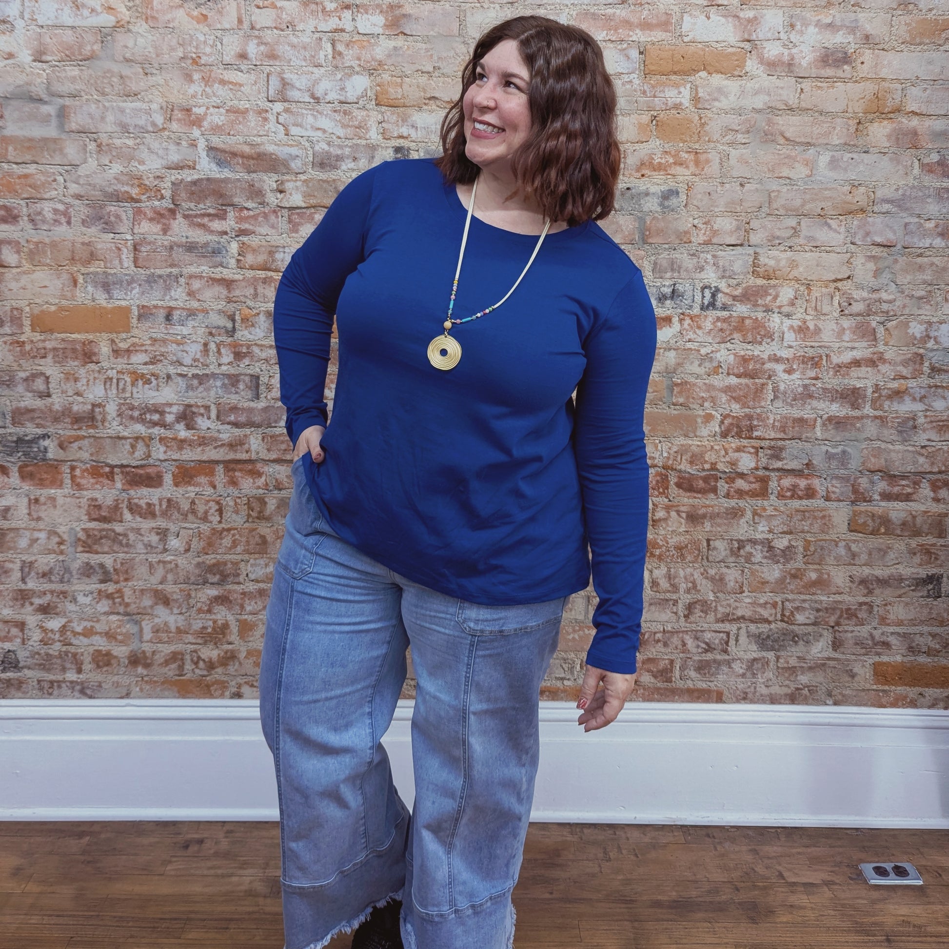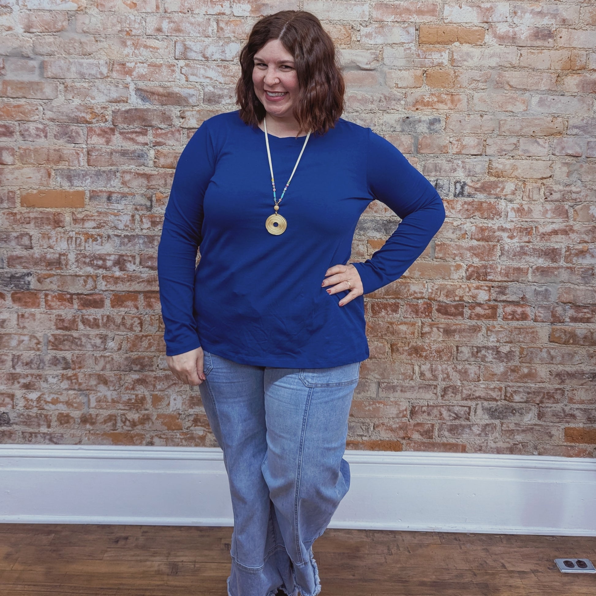 We love that this basic is a fun color! Wear it underneath a sweater, jacket, vest, ect. Or wear it on its own with a fun statement necklace! This top is very soft and the perfect length for tucking in or wearing down. Plus the navy blue color is just darling!