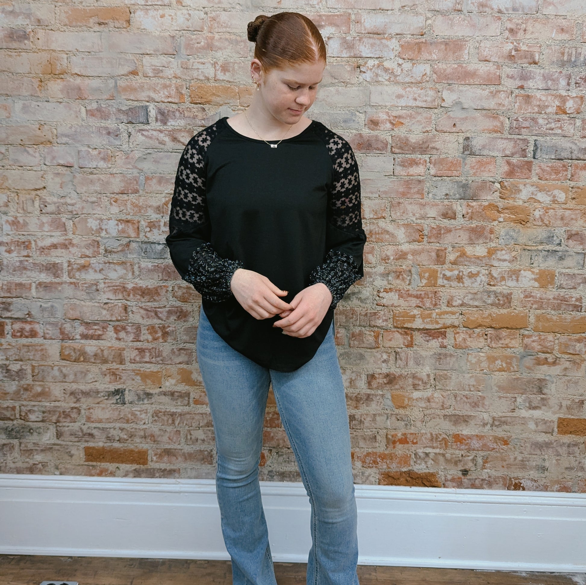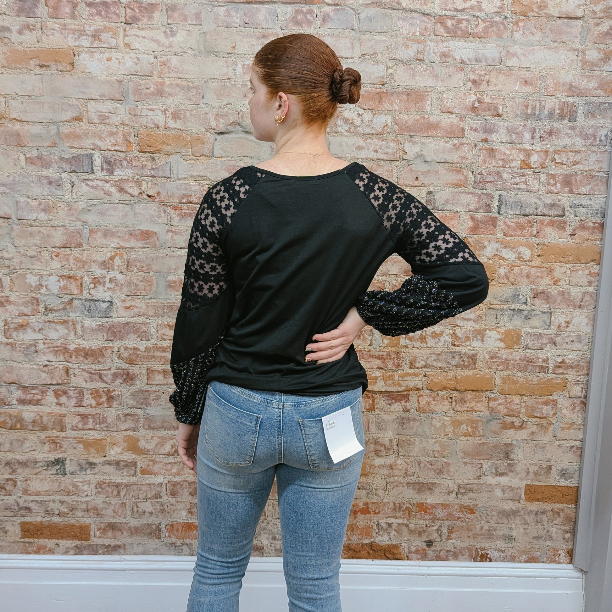 This top is a perfect, elevated basic! It's a plain black top with the cutest sleeves. The sleeves have a flower Patterned lace on the top, plain black in the middle, and then sheer black with tinsel on the bottom. They are also a bubble style sleeve and cinch at the wrist. This top is perfect for going out! Pair it with some dark wash jeans and you're all set!
